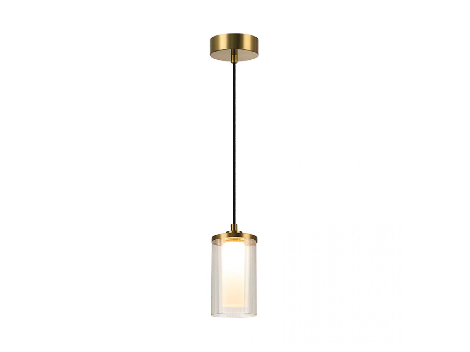 Noria ist eine raffinierte einzelne Pendelleuchte mit einer eleganten goldmatten Oberfläche und einem Doppelglasdesign mit einem klaren äusseren Schirm und einem opalenen inneren Diffusor.