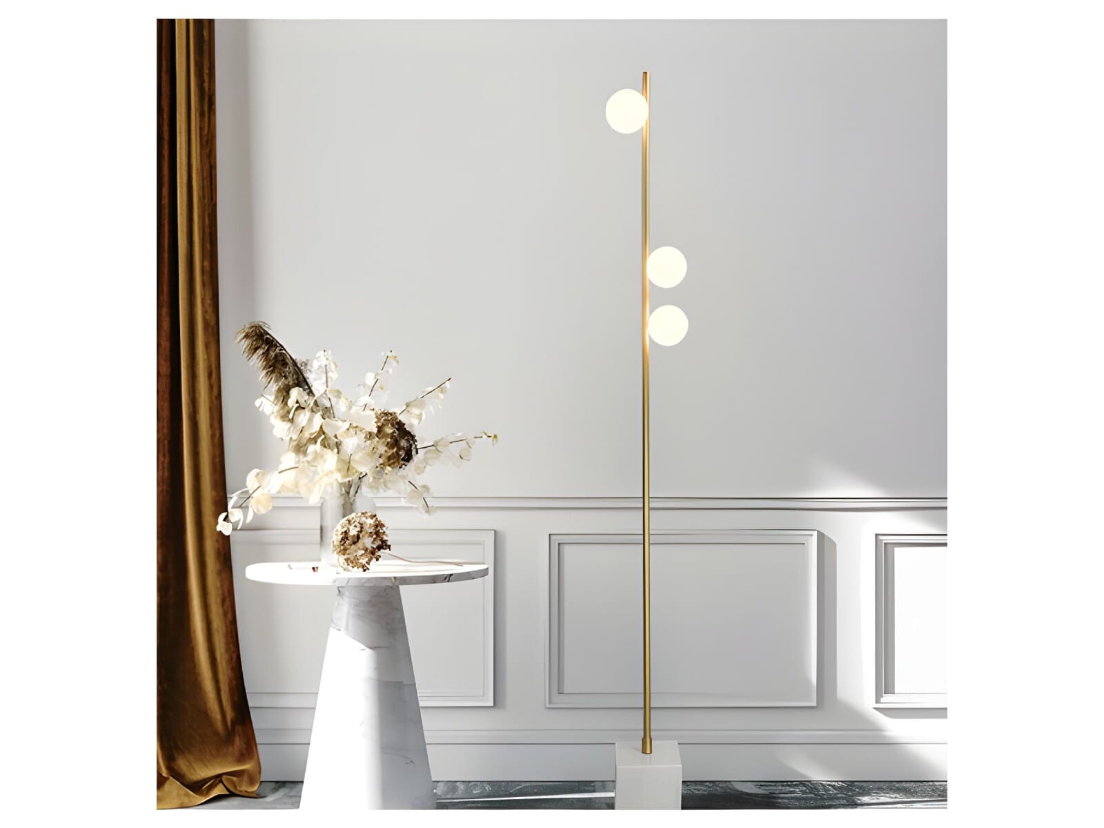 Das schlanke Gestell aus schwarzem Metall erhebt sich auf einem massiven Marmorsockel, der sowohl Stabilität als auch Raffinesse bietet. Das Design wird durch drei Opalglaskugeln hervorgehoben, die ein warmes, diffuses Licht ausstrahlen und eine gemütliche und einladende Atmosphäre schaffen. Triteria ist ideal für Wohnzimmer, Schlafzimmer oder Leseecken und dient sowohl als funktionale Lichtquelle als auch als dekoratives Element. Ihre klaren Linien und luxuriösen Details machen sie zu einem herausragenden Stück in jedem modernen Interieur.