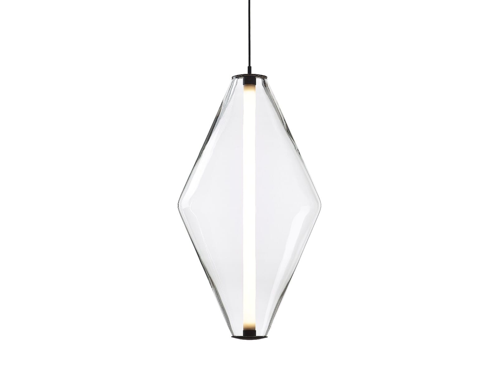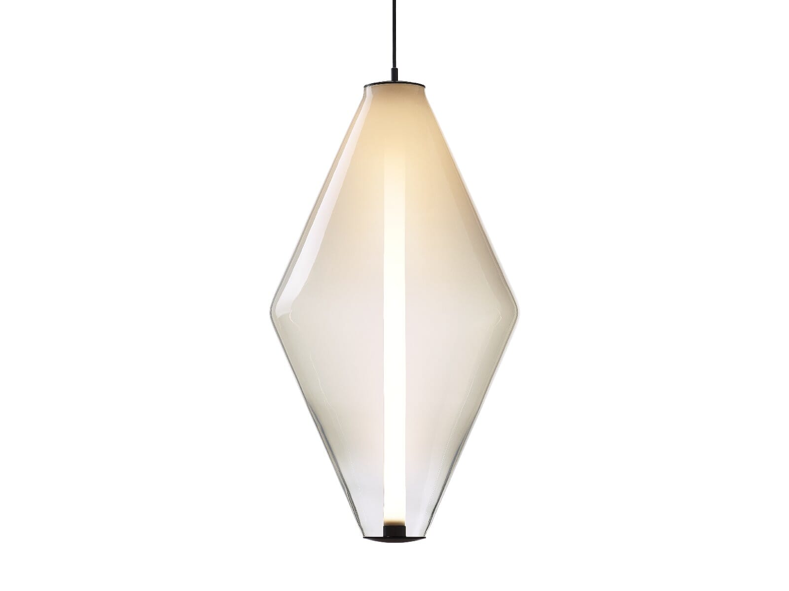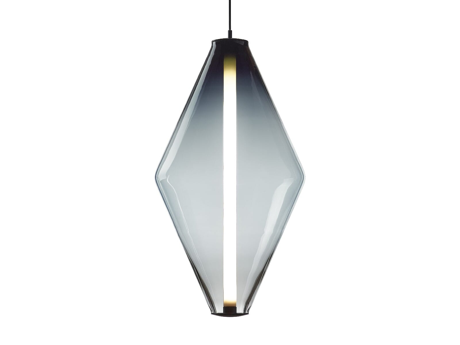 Orae Dia ist eine skulpturale Pendelleuchte, die sich durch ihre sich überschneidenden, mundgeblasenen Rauchglas-Kegel auszeichnet, die einen weichen, leuchtenden Kern in eleganten schwarzen Fassungen umschliessen.